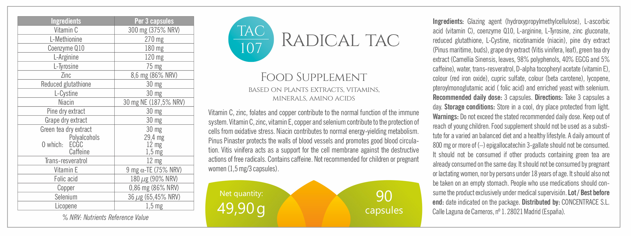 Food supplement based on plants extracts, vitamins. Minerals, amino acids.