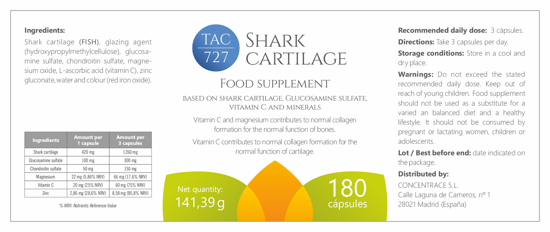 Dietary supplement made with shark cartilage, glucosamine sulfate, vitamin C, and minerals.